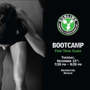 Tuesday, December 12th we have a free trial Bootcamp class. It’ll be a sweaty hour of fun! Email claire@sublimesc.com to reserve a spot.